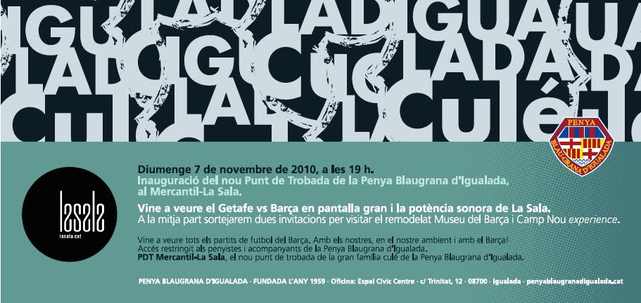 Coincidint amb el proper partit de lliga entre el Getafe i el FCBarcelona, que es disputarà el proper diumenge dia 7 de novembre a les 19h, la Penya Blaugrana d’Igualada estrenarà el nou Punt De Trobada Mercantil-La Sala.