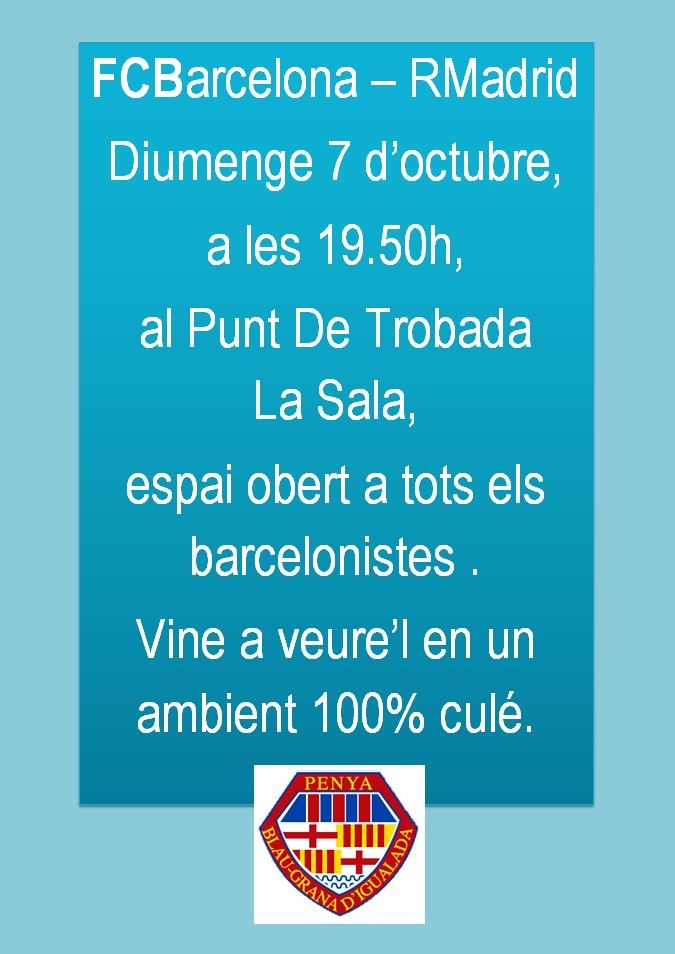 La Penya Blaugrana d’Igualada posa a l’abast dels seus associats i amics el Punt De Trobada del Mercantil-La Sala per al seguiment del Barça – Madrid del proper diumenge dia 7 d’octubre, a les 19.50h.