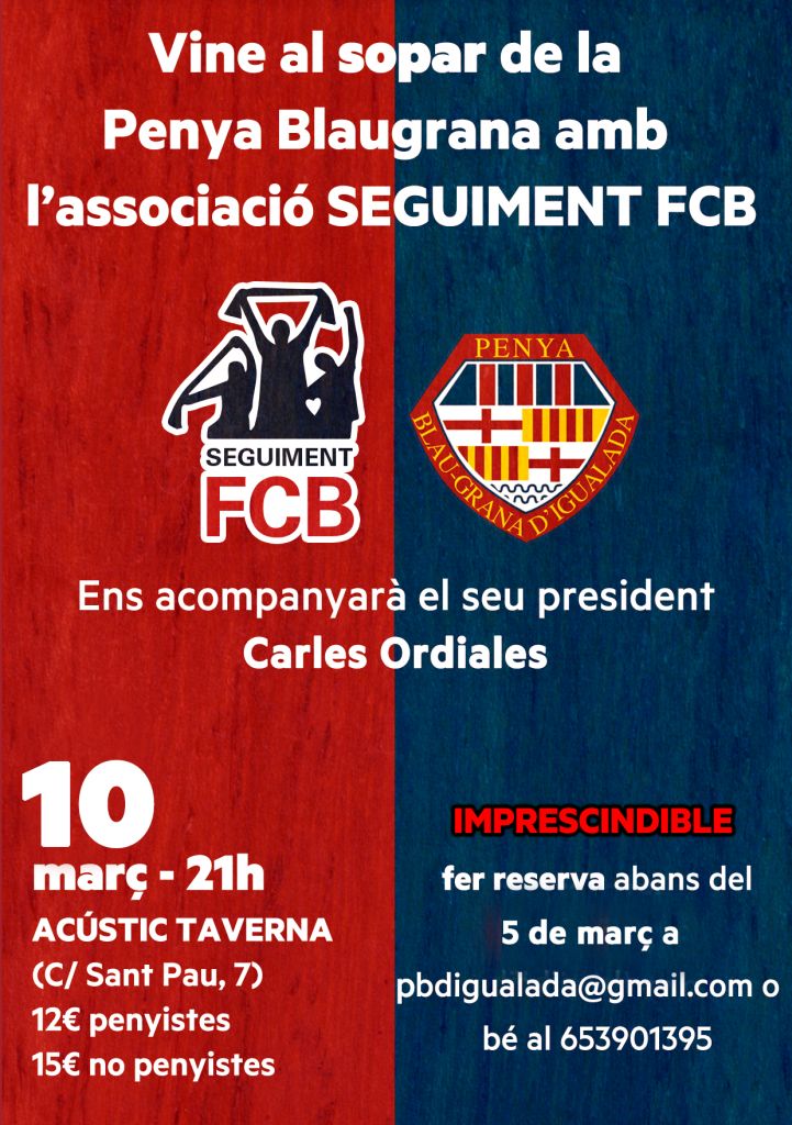 Degut a la data del partit Rayo-Barça, el sopar de la Penya Blaugrana d’Igualada amb Carles Ordiales, President de l’associació SeguimentFCB, passa al dijous 10 de març.