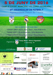 El proper diumenge 5 de juny, es disputarà el segon triangular de futbol 7 de penyes de l’Anoia, en el qual hi prenen part les penyes Blanc i Blava, Madridista i Blaugrana.