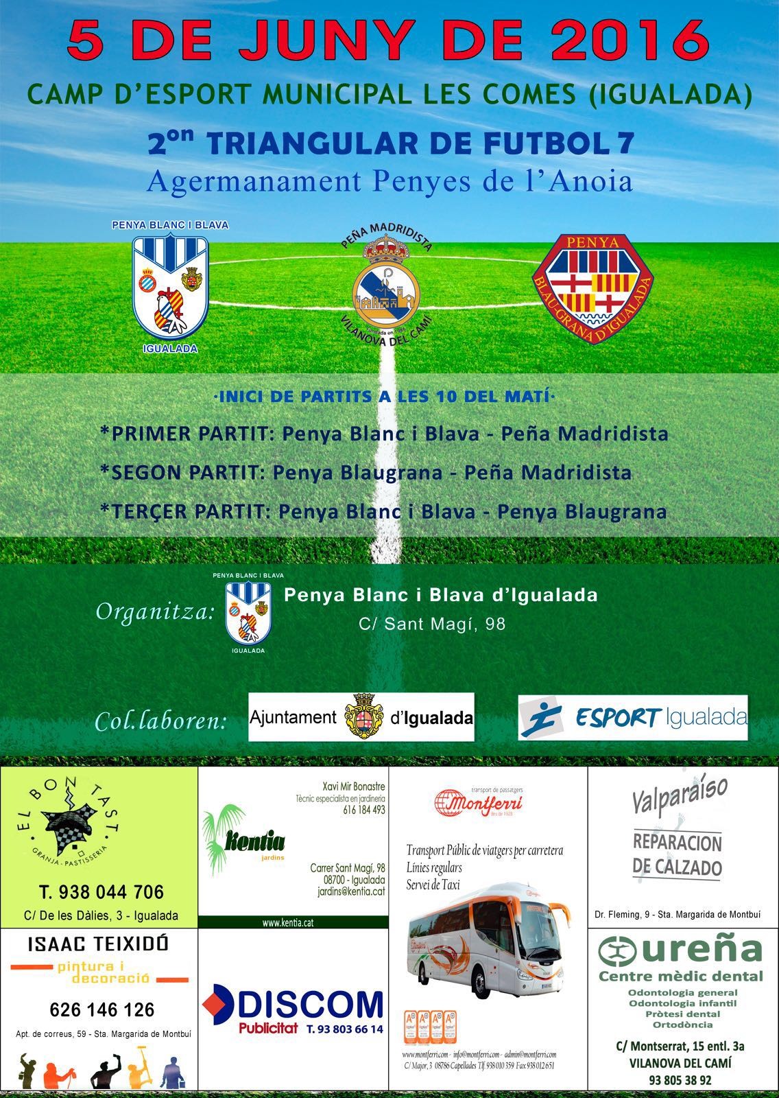 El proper diumenge 5 de juny, es disputarà el segon triangular de futbol 7 de penyes de l’Anoia, en el qual hi prenen part les penyes Blanc i Blava, Madridista i Blaugrana.